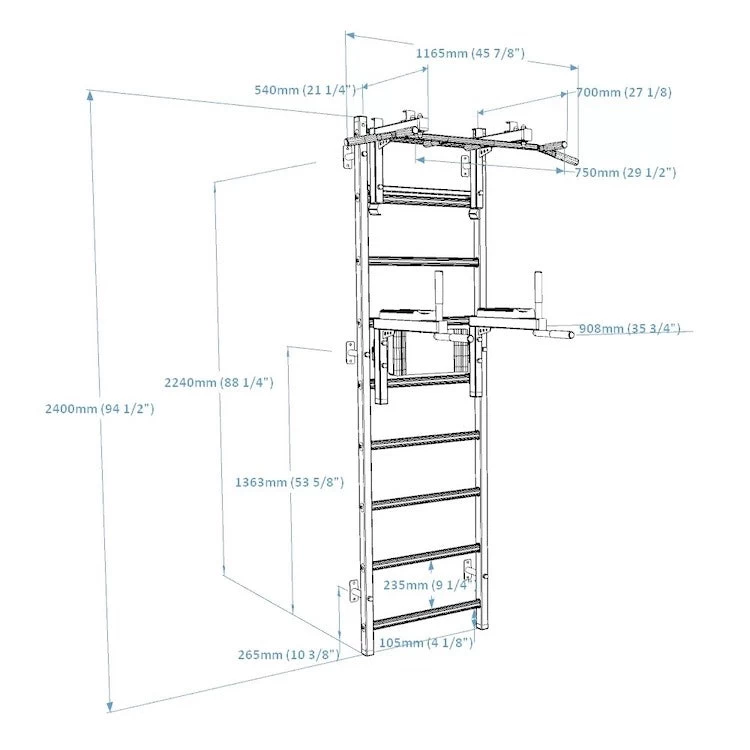 Includes an assembly kit (does not include wall mounting set, as its type depends on the type of wall which the stall bar will be attached to). The decision and responsibility for the method of installation of the stall bar rests with the customer. Wall mounting is not possible to a plasterboard wall. The minimum required wall thickness in the case of installation with the use of Fischer expansion bolts available from BenchK is 12 cm/4,7″. In all other cases, it is a recommended thickness only. For other wall fixings please see manufacturers recommendations.