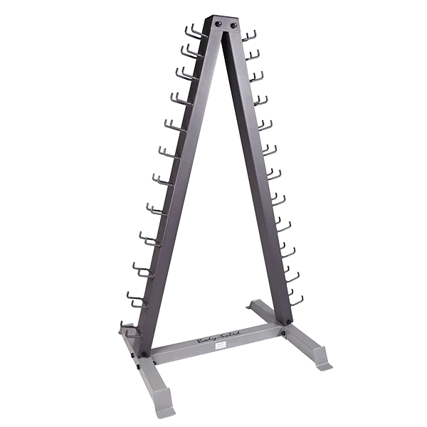 Keep your dumbbells close at hand with the all-new Body-Solid Tools GDR24 12-Pair Vertical Dumbbell Rack. Designed to hold up to twelve vinyl or neoprene dumbbells ranging from one to 15 lbs., this rack is the perfect complement to any workout space. The space-saving design includes individual cradles for each dumbbell and solid steel construction ensures durability in any setting. The GDR24 12-Pair Vertical Dumbbell Rack is the ideal storage option for both home or commercial use.Â