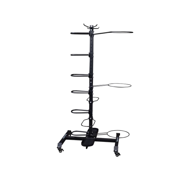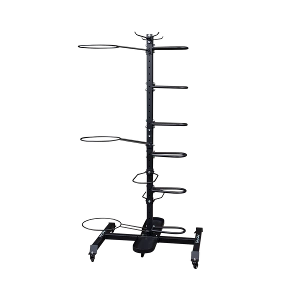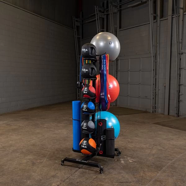 The Body-Solid GAR100 Multi Accessory Rack combines the most popular storage racks into one compact, easy storage solution. The GAR100 is designed to store medicine balls, slam balls, stability balls, resistance tubes, bands, workout mats and more. The entire GAR100 upright is drilled, allowing users to customize the height and spread of the medicine ball and stability ball holders. The included caster wheels allow for easy mobility and portability but can be left off for those who wish to bolt the GAR100 to the floor.