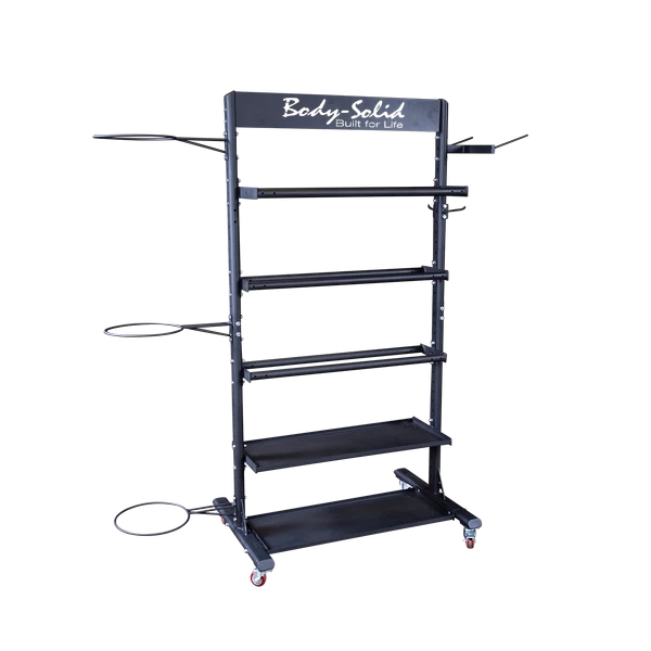 Designed to store medicine balls, slam balls, stability balls, kettlebells, dumbbells and more, the GAR250 is one of the more versatile storage towers in the industry. Three round tube shelves make for ideal storage of medicine balls, wall balls and slam balls. The top round tube shelf includes a place to hang mats, towels, bands, tubes and more. Two heavy-duty, high capacity trays (40” wide x 15.5” deep) accommodate dumbbells, kettlebells and just about anything else. Additionally, the GAR250 features hanging mat storage, pegs for accessories, cable handles, resistance bands/tubes and more as well as three stability/swiss ball holders. Included locking caster wheels allow for easy mobility and can be removed if desired.