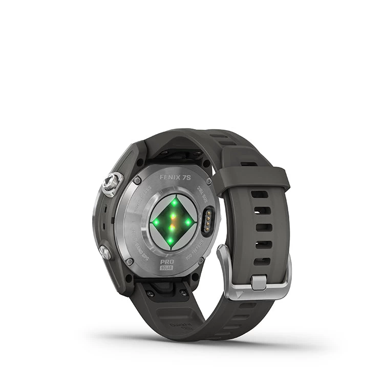 fēnix® 7S Pro Solar is the ultimate multisport GPS smartwatch optimized for smaller wrists and designed to perform all day, every day. Get weeks of battery life with the Power Glass™ solar charging lens. Meet any challenge with advanced training features such as hill score, which measures your climbing performance over time, and real-time stamina updates to gauge your stamina potential. For a more complete picture of your health, training and recovery, tap into 24/7 health and wellness monitoring with advanced sleep tracking, HRV status, Pulse Ox and more (this is not a medical device, and data presented is intended to be a close estimation of metrics tracked; Pulse Ox not available in all countries). When the sun sets, use the LED flashlight to stay visible or find your way. Download TopoActive maps from around the world to keep your explorations on track. Navigate on the slopes with 2,000 preloaded ski resort maps worldwide. Adventure far off the grid with up to 14 days of battery life in smartwatch mode with solar charging in 3 hours of direct sunlight (50,000 lux) per day. Gain superior positioning accuracy while optimizing battery life, thanks to multi-band GPS with SatIQ™ technology.