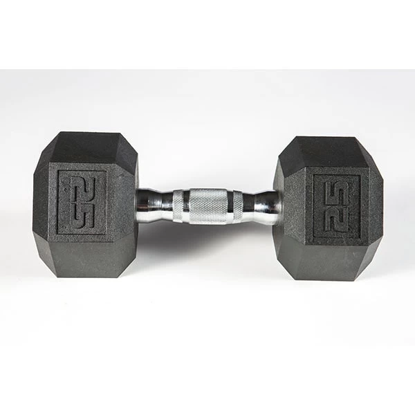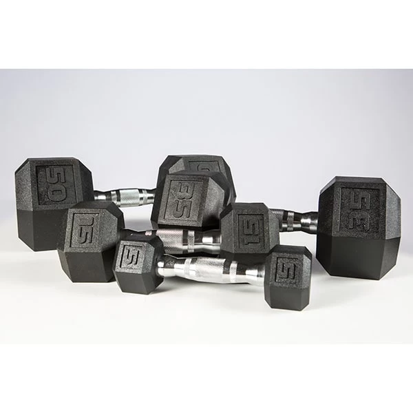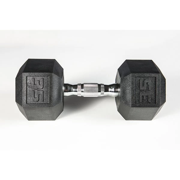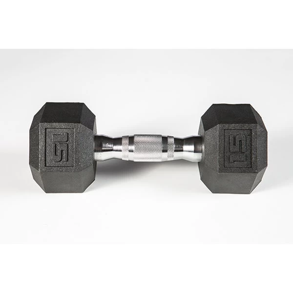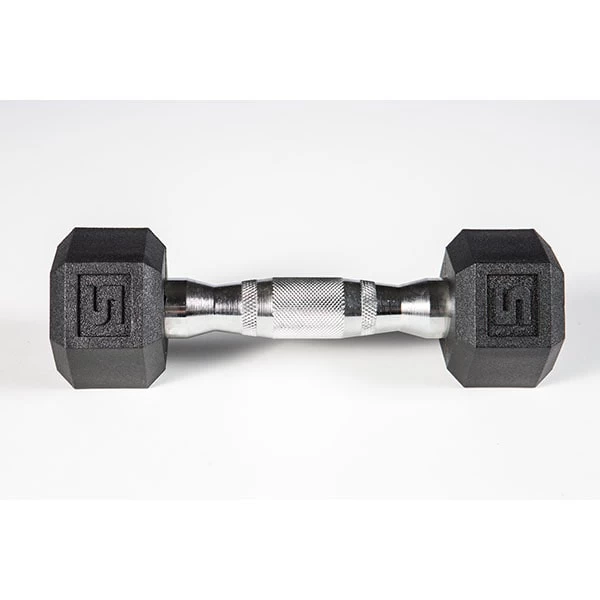 Ideal for any gym but perfect for small spaces due to the lack of a rubber odor, the York Barbell Premium PVC coated dumbbells were developed with York’s enduring standard of performance and function. These dumbbells feature a heavily contoured ergonomic chrome handle with aggressive knurling for a tight grip. The premium PVC coating increases durability, protects flooring and equipment, diminishes noise and is easy to clean. The attractive chrome handle and jet-black dumbbell heads compliment most work out spaces and the hexagonal shape prevents unwanted rolling.